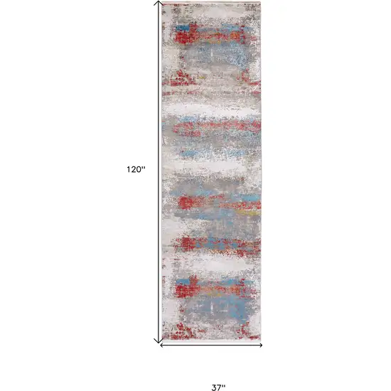 10' Gray Blue and Red Abstract Power Loom Runner Rug With Fringe