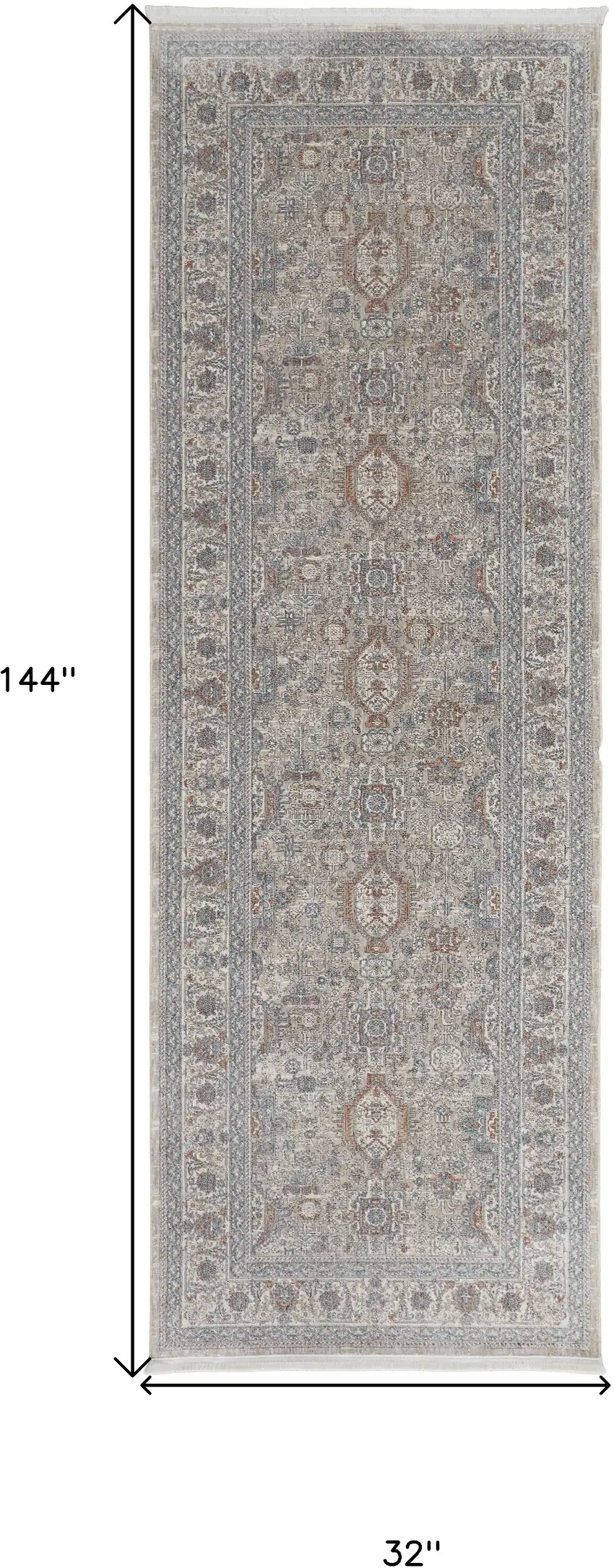 This 12-foot silver taupe and blue oriental power loom worn faded runner rug with fringe, is a great way to add warmth to a room. This runner shaped rug features a oriental design in silver taupe and blue to give it visual interest. A classic shape marries with good looking design for your space ideal for spaces with kids and pets, this rug is stain resistant to help repel stains and spilled liquids. Tassel ends bring a timeless and fashionable look to your interior. Place this area rug against a hardwood or tile floor and it will enliven your living space with style and sophistication. 32-inch H x 144-inch W x 0.25-inch D