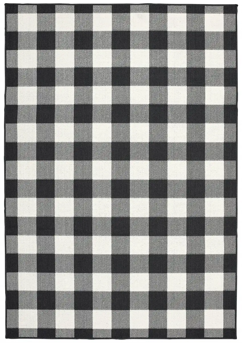 This rug flaunts a charming black and ivory gingham design. It effortlessly complements different styles whether it's placed inside your home or out on the patio.