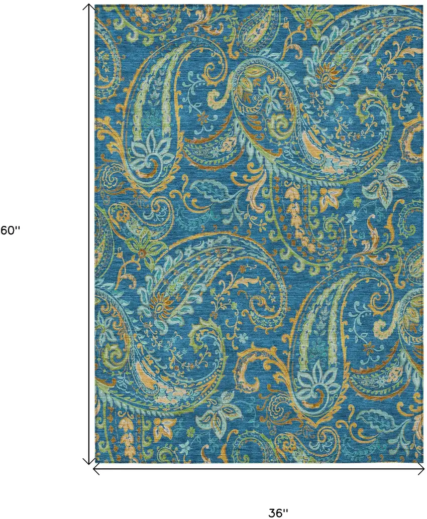 3' X 5' Navy Blue Paisley Washable Non Skid Indoor Outdoor Area Rug
