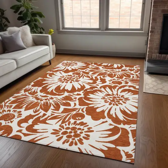 Add some artistry to your room with this 3-foot x 5-foot rust and ivory floral washable stain resistant non skid indoor outdoor area rug. This rectangle shaped rug features a floral design in rust and ivory to give it visual interest. A classic shape marries with good looking design for your space ideal for spaces with kids and pets, this rug is stain resistant to help repel stains and spilled liquids. Place this area rug against a hardwood or tile floor and it will enliven your living space with style and sophistication. 36-inch H x 60-inch W x 0.19-inch D