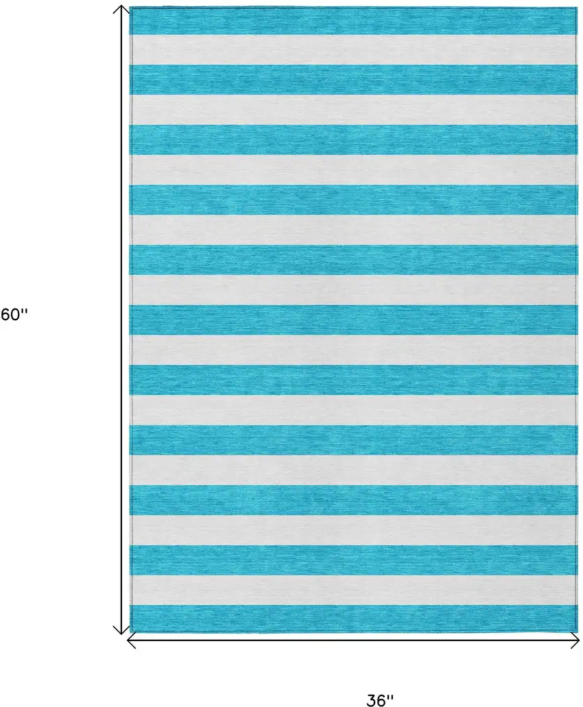 3' X 5' Teal Striped Washable Non Skid Indoor Outdoor Area Rug