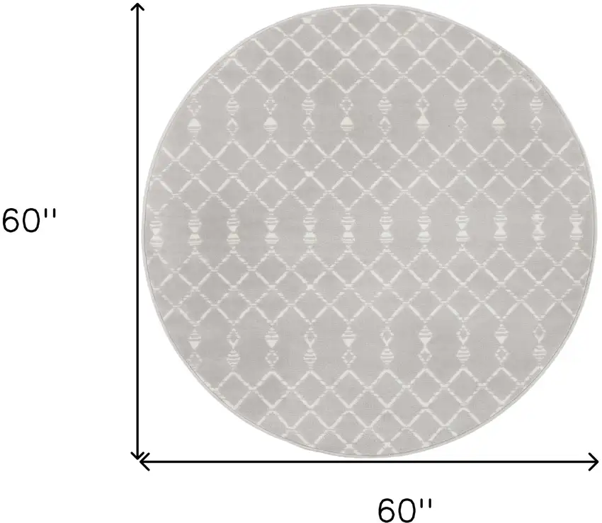 Set an inviting tone in your space with this 5-foot gray and ivory geometric round rug. Ideal for spaces with kids and pets, this rug is stain resistant to help repel dirt and spilled liquids. Built to last, this rug crafted from polyester fibers is known for its durability and long lasting appeal. Rugs are a great way to showcase your style, hide imperfections, warm your home and reduce noise. This geometric round shaped rug features a geometric pattern in gray and ivory that combines a good looking print with a unique and updated shape. The mix of shape, color, and design gives this rug refreshing visual interest. This larger sized, bohemian styled rug is ready to create a focal point or statement piece in your room. 60-inch h x 60-inch w x 0.39-inch d.