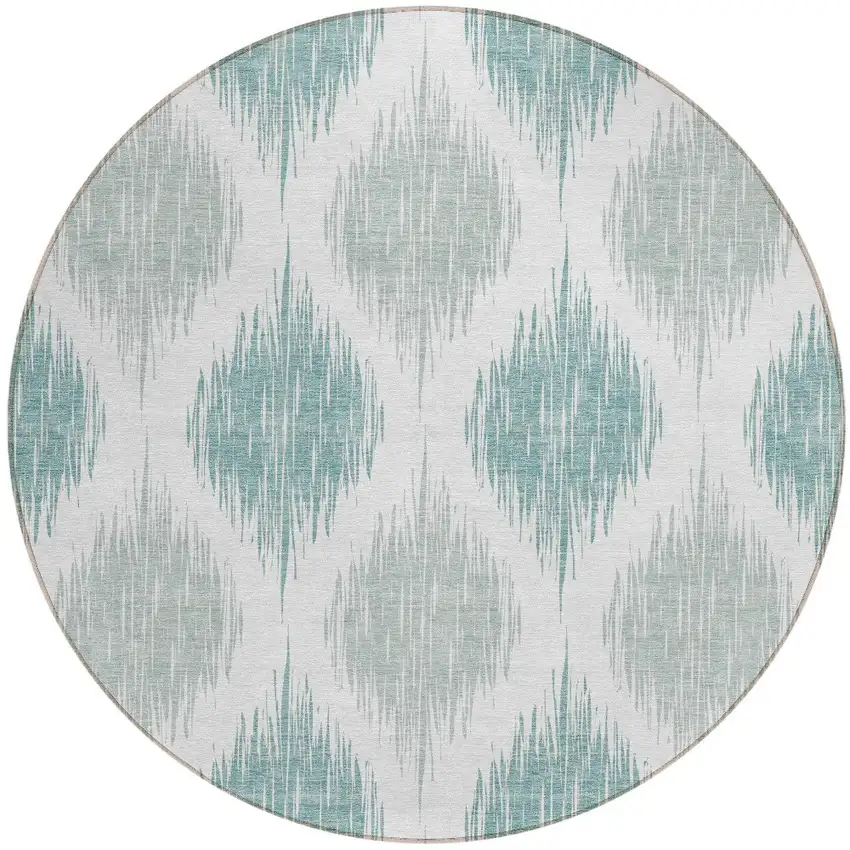 Add some artistry to your room with this 8-foot aqua teal blue and ivory round ikat washable indoor outdoor area rug. This geometric round shaped rug features a ikat pattern in aqua, teal blue, and ivory that combines a good looking print with a unique and updated shape. The mix of shape, color, and design gives this rug refreshing visual interest. Ideal for outdoor spaces or high traffic areas with kids and pets, this rug is made from heavy duty polyester that is stain resistant to help repel water, dirt, and stains. Makes a great way to dress up your patio, porch, or poolside, but also works well as a durable and easy to maintain option in the kitchen, family room, or mudroom. 96-inch h x 96-inch w x 0.19-inch d.