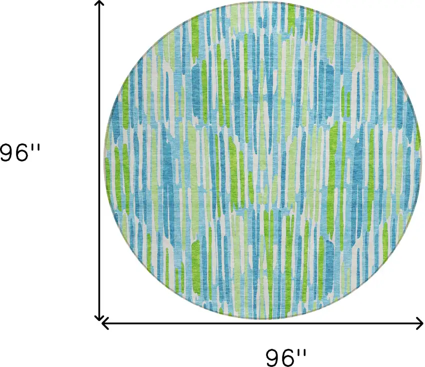 Add some artistry to your room with this 8-foot aqua teal blue and lime green round abstract washable indoor outdoor area rug. This geometric round shaped rug features a abstract pattern in aqua, teal blue, and lime green that combines a good looking print with a unique and updated shape. The mix of shape, color, and design gives this rug refreshing visual interest. Ideal for outdoor spaces or high traffic areas with kids and pets, this rug is made from heavy duty polyester that is stain resistant to help repel water, dirt, and stains. Makes a great way to dress up your patio, porch, or poolside, but also works well as a durable and easy to maintain option in the kitchen, family room, or mudroom. 96-inch h x 96-inch w x 0.19-inch d.