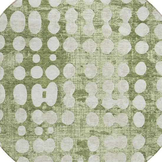 This 8-foot artichoke green and ivory round abstract washable indoor outdoor area rug, is a great way to add warmth to a room. This geometric round shaped rug features a abstract pattern in artichoke green and ivory that combines a good looking print with a unique and updated shape. The mix of shape, color, and design gives this rug refreshing visual interest. Ideal for outdoor spaces or high traffic areas with kids and pets, this rug is made from heavy duty polyester that is stain resistant to help repel water, dirt, and stains. Versatile in use, durable, and easy to maintain, this rug is an ideal solution to add a decorative and inviting touch to your indoor or outdoor space. 96-inch h x 96-inch w x 0.19-inch d.