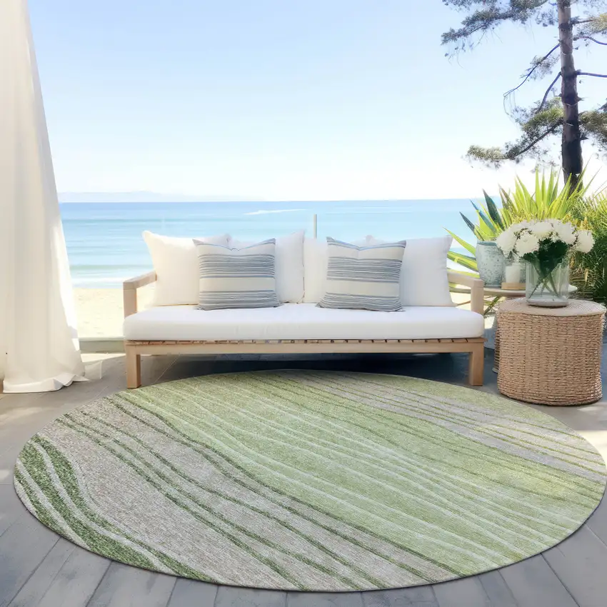 Set an inviting tone in your space with this 8-foot artichoke green and taupe round striped washable indoor outdoor area rug. This geometric round shaped rug features a striped pattern in artichoke green and taupe that combines a good looking print with a unique and updated shape. The mix of shape, color, and design gives this rug refreshing visual interest. Ideal for outdoor spaces or high traffic areas with kids and pets, this rug is made from heavy duty polyester that is stain resistant to help repel water, dirt, and stains. Makes a great way to dress up your patio, porch, or poolside, but also works well as a durable and easy to maintain option in the kitchen, family room, or mudroom. 96-inch h x 96-inch w x 0.19-inch d.