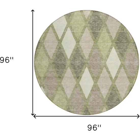 Set an inviting tone in your space with this 8-foot artichoke green beige and ivory round geometric washable indoor outdoor area rug. This geometric round shaped rug features a geometric pattern in artichoke green, beige, and ivory that combines a good looking print with a unique and updated shape. The mix of shape, color, and design gives this rug refreshing visual interest. Ideal for outdoor spaces or high traffic areas with kids and pets, this rug is made from heavy duty polyester that is stain resistant to help repel water, dirt, and stains. Makes a great way to dress up your patio, porch, or poolside, but also works well as a durable and easy to maintain option in the kitchen, family room, or mudroom. 96-inch h x 96-inch w x 0.19-inch d.