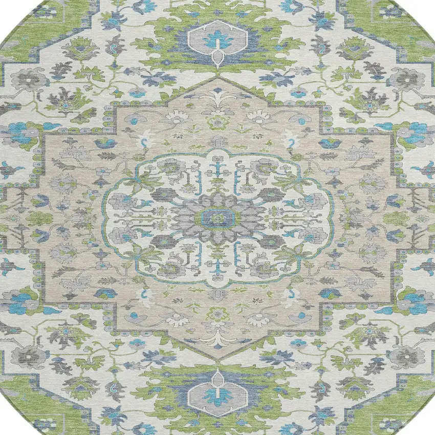 Add some artistry to your room with this 8-foot artichoke green blue and ivory round oriental washable indoor outdoor area rug. This geometric round shaped rug features a oriental pattern in artichoke green, blue, and ivory that combines a good looking print with a unique and updated shape. The mix of shape, color, and design gives this rug refreshing visual interest. Ideal for outdoor spaces or high traffic areas with kids and pets, this rug is made from heavy duty polyester that is stain resistant to help repel water, dirt, and stains. Versatile in use, durable, and easy to maintain, this rug is an ideal solution to add a decorative and inviting touch to your indoor or outdoor space. 96-inch h x 96-inch w x 0.19-inch d.