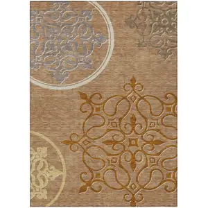 8' Beige And Ivory Round Geometric Washable Indoor Outdoor Area Rug