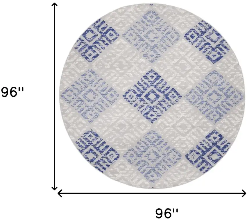 This 8-foot beige blue and gray geometric round rug, is a great way to add warmth to a room. Ideal for spaces with kids and pets, this rug is stain resistant to help repel dirt and spilled liquids. Built to last, this rug crafted from polypropylene fibers is known for its durability and long lasting appeal. Rugs are a great way to showcase your style, hide imperfections, warm your home and reduce noise. This geometric round shaped rug features a geometric pattern in beige, blue, and gray that combines a good looking print with a unique and updated shape. The mix of shape, color, and design gives this rug refreshing visual interest. This larger sized, bohemian styled rug is ready to create a focal point or statement piece in your room. 96-inch h x 96-inch w x 0.39-inch d.