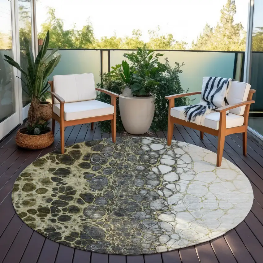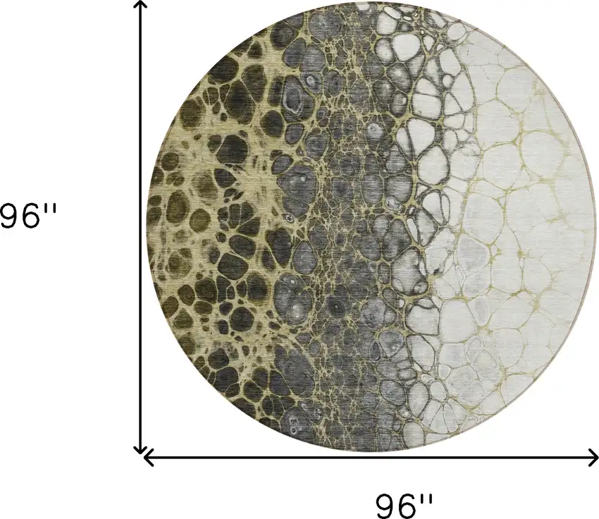Set an inviting tone in your space with this 8-foot beige taupe and chocolate round abstract washable indoor outdoor area rug. This geometric round shaped rug features a abstract pattern in beige, taupe, and chocolate that combines a good looking print with a unique and updated shape. The mix of shape, color, and design gives this rug refreshing visual interest. Ideal for outdoor spaces or high traffic areas with kids and pets, this rug is made from heavy duty polyester that is stain resistant to help repel water, dirt, and stains. Versatile in use, durable, and easy to maintain, this rug is an ideal solution to add a decorative and inviting touch to your indoor or outdoor space. 96-inch h x 96-inch w x 0.19-inch d.