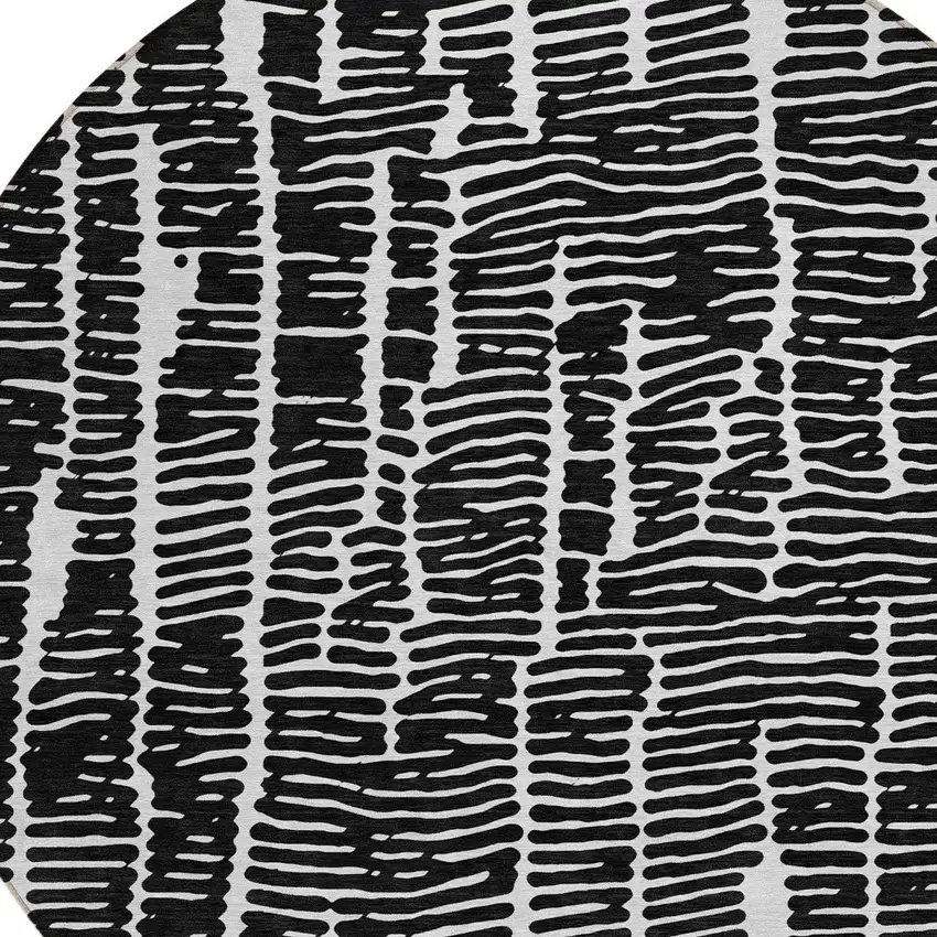 This 8-foot black and ivory round abstract washable indoor outdoor area rug, is a great way to add warmth to a room. This geometric round shaped rug features a abstract pattern in black and ivory that combines a good looking print with a unique and updated shape. The mix of shape, color, and design gives this rug refreshing visual interest. The coloration of this rug infuses an updated and modern vibe into your space. Ideal for outdoor spaces or high traffic areas with kids and pets, this rug is made from heavy duty polyester that is stain resistant to help repel water, dirt, and stains. Makes a great way to dress up your patio, porch, or poolside, but also works well as a durable and easy to maintain option in the kitchen, family room, or mudroom. 96-inch h x 96-inch w x 0.19-inch d.