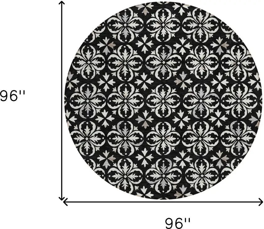 8' Black And Ivory Round Floral Washable Indoor Outdoor Area Rug