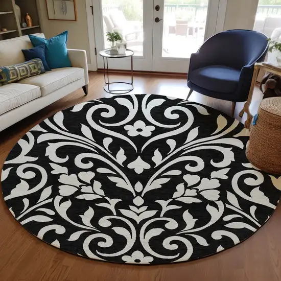 8' Black And Ivory Round Floral Washable Indoor Outdoor Area Rug