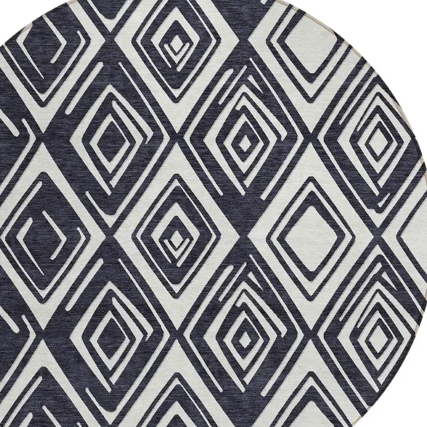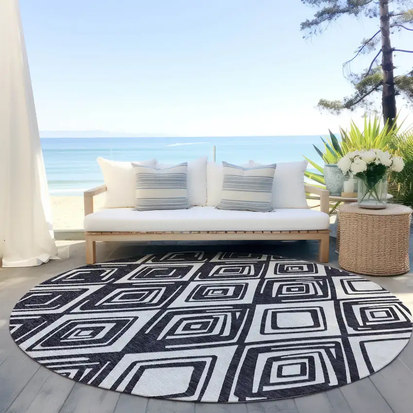 8' Black And Ivory Round Geometric Washable Indoor Outdoor Area Rug