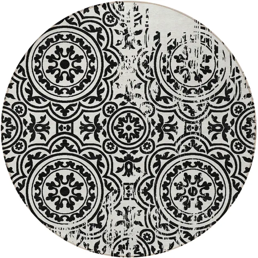 8' Black And Ivory Round Medallion Washable Indoor Outdoor Area Rug