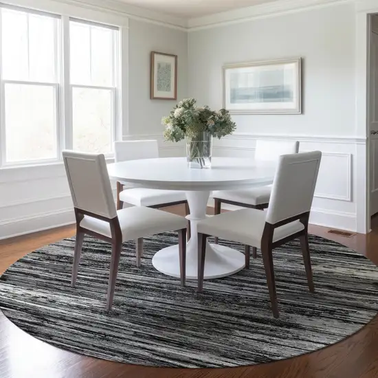 Add some artistry to your room with this 8-foot black and ivory round striped washable indoor outdoor area rug. This geometric round shaped rug features a striped pattern in black and ivory that combines a good looking print with a unique and updated shape. The mix of shape, color, and design gives this rug refreshing visual interest. Ideal for outdoor spaces or high traffic areas with kids and pets, this rug is made from heavy duty polyester that is stain resistant to help repel water, dirt, and stains. Versatile in use, durable, and easy to maintain, this rug is an ideal solution to add a decorative and inviting touch to your indoor or outdoor space. 96-inch h x 96-inch w x 0.19-inch d.