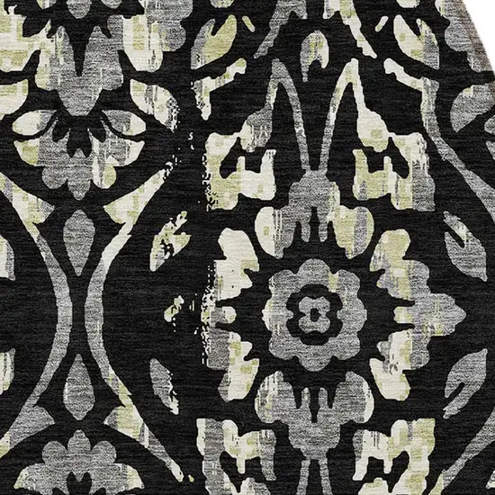 Add great coloration and comfortable texture to your space with this 8-foot black gray and ivory round floral washable indoor outdoor area rug. This geometric round shaped rug features a floral pattern in black, gray, and ivory that combines a good looking print with a unique and updated shape. The mix of shape, color, and design gives this rug refreshing visual interest. Ideal for outdoor spaces or high traffic areas with kids and pets, this rug is made from heavy duty polyester that is stain resistant to help repel water, dirt, and stains. Versatile in use, durable, and easy to maintain, this rug is an ideal solution to add a decorative and inviting touch to your indoor or outdoor space. 96-inch h x 96-inch w x 0.19-inch d.