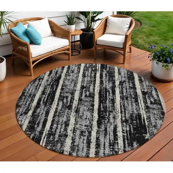 This 8-foot black gray and ivory round striped washable indoor outdoor area rug, is a great way to add warmth to a room. This geometric round shaped rug features a striped pattern in black, gray, and ivory that combines a good looking print with a unique and updated shape. The mix of shape, color, and design gives this rug refreshing visual interest. Ideal for outdoor spaces or high traffic areas with kids and pets, this rug is made from heavy duty polyester that is stain resistant to help repel water, dirt, and stains. Versatile in use, durable, and easy to maintain, this rug is an ideal solution to add a decorative and inviting touch to your indoor or outdoor space. 96-inch h x 96-inch w x 0.19-inch d.