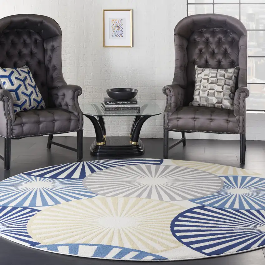 8' Blue and Ivory Round Geometric Power Loom Area Rug