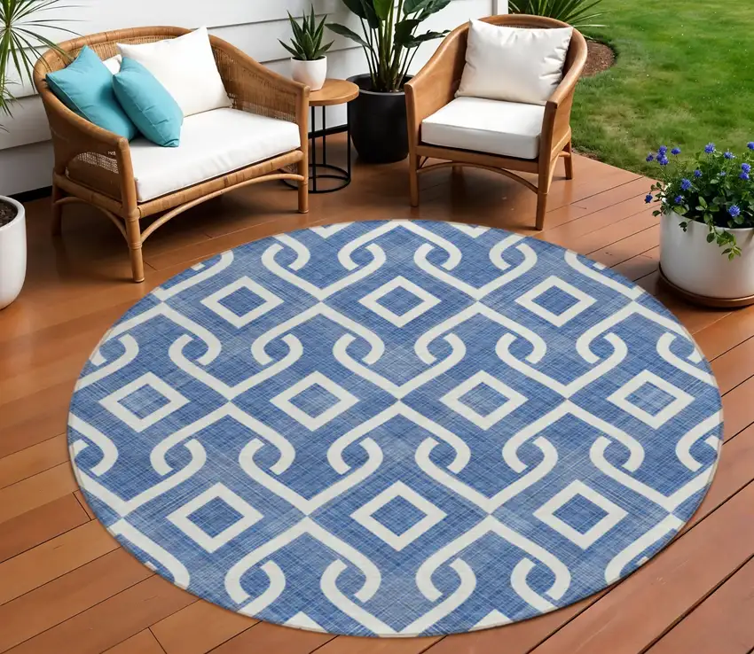 8' Blue And Ivory Round Geometric Washable Indoor Outdoor Area Rug