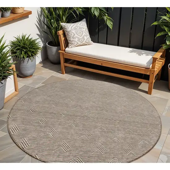 Add great coloration and comfortable texture to your space with this 8-foot brown and beige round geometric washable indoor outdoor area rug. This geometric round shaped rug features a geometric pattern in brown and beige that combines a good looking print with a unique and updated shape. The mix of shape, color, and design gives this rug refreshing visual interest. Ideal for outdoor spaces or high traffic areas with kids and pets, this rug is made from heavy duty polyester that is stain resistant to help repel water, dirt, and stains. Versatile in use, durable, and easy to maintain, this rug is an ideal solution to add a decorative and inviting touch to your indoor or outdoor space. 96-inch h x 96-inch w x 0.19-inch d.