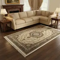 This 8-foot brown and ivory abstract washable round rug with uv protection, is a great way to add warmth to a room. Ideal for spaces with kids and pets, this rug is stain resistant to help repel dirt and spilled liquids. Built to last, this rug crafted from polyester fibers is known for its durability and long lasting appeal. Rugs are a great way to showcase your style, hide imperfections, warm your home and reduce noise. This larger sized, transitional styled rug is ready to create a focal point or statement piece in your room. 96.00-inch h x 96.00-inch w x 0.39-inch d.