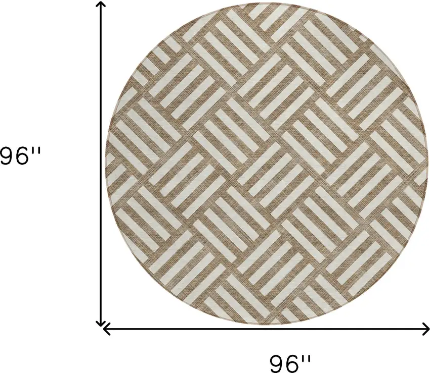 8' Brown And Ivory Round Geometric Washable Indoor Outdoor Area Rug