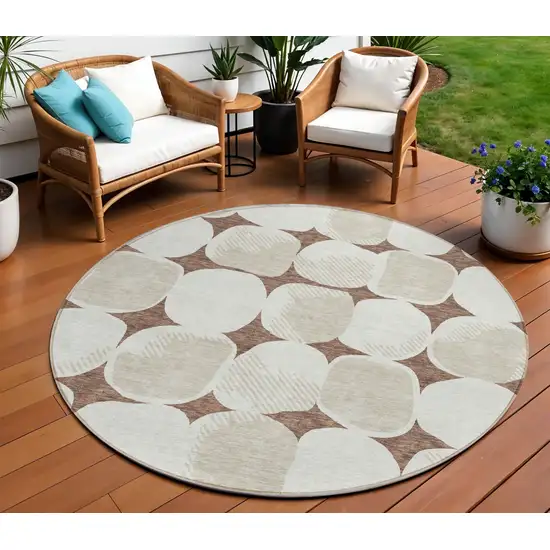 This 8-foot brown beige and ivory round abstract washable indoor outdoor area rug, is a great way to add warmth to a room. This geometric round shaped rug features a abstract pattern in brown, beige, and ivory that combines a good looking print with a unique and updated shape. The mix of shape, color, and design gives this rug refreshing visual interest. Ideal for outdoor spaces or high traffic areas with kids and pets, this rug is made from heavy duty polyester that is stain resistant to help repel water, dirt, and stains. Versatile in use, durable, and easy to maintain, this rug is an ideal solution to add a decorative and inviting touch to your indoor or outdoor space. 96-inch h x 96-inch w x 0.19-inch d.
