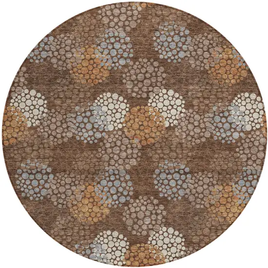 Add some artistry to your room with this 8-foot brown gray and ivory round polka dot washable indoor outdoor area rug. This geometric round shaped rug features a polka dot pattern in brown, gray, and ivory that combines a good looking print with a unique and updated shape. The mix of shape, color, and design gives this rug refreshing visual interest. Ideal for outdoor spaces or high traffic areas with kids and pets, this rug is made from heavy duty polyester that is stain resistant to help repel water, dirt, and stains. Versatile in use, durable, and easy to maintain, this rug is an ideal solution to add a decorative and inviting touch to your indoor or outdoor space. 96-inch h x 96-inch w x 0.19-inch d.