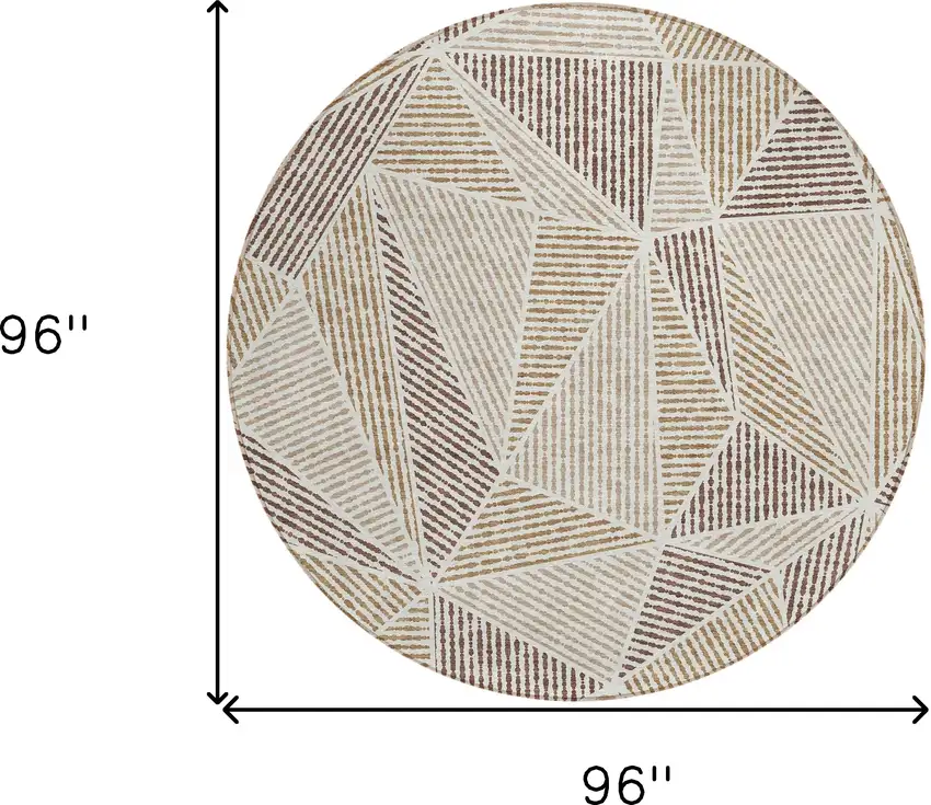 Add some artistry to your room with this 8-foot brown taupe and beige round geometric washable indoor outdoor area rug. This geometric round shaped rug features a geometric pattern in brown, taupe, and beige that combines a good looking print with a unique and updated shape. The mix of shape, color, and design gives this rug refreshing visual interest. Ideal for outdoor spaces or high traffic areas with kids and pets, this rug is made from heavy duty polyester that is stain resistant to help repel water, dirt, and stains. Makes a great way to dress up your patio, porch, or poolside, but also works well as a durable and easy to maintain option in the kitchen, family room, or mudroom. 96-inch h x 96-inch w x 0.19-inch d.