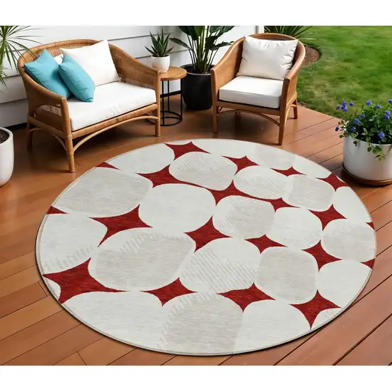 Add some artistry to your room with this 8-foot burgundy beige and ivory round abstract washable indoor outdoor area rug. This geometric round shaped rug features a abstract pattern in burgundy, beige, and ivory that combines a good looking print with a unique and updated shape. The mix of shape, color, and design gives this rug refreshing visual interest. Ideal for outdoor spaces or high traffic areas with kids and pets, this rug is made from heavy duty polyester that is stain resistant to help repel water, dirt, and stains. Makes a great way to dress up your patio, porch, or poolside, but also works well as a durable and easy to maintain option in the kitchen, family room, or mudroom. 96-inch h x 96-inch w x 0.19-inch d.
