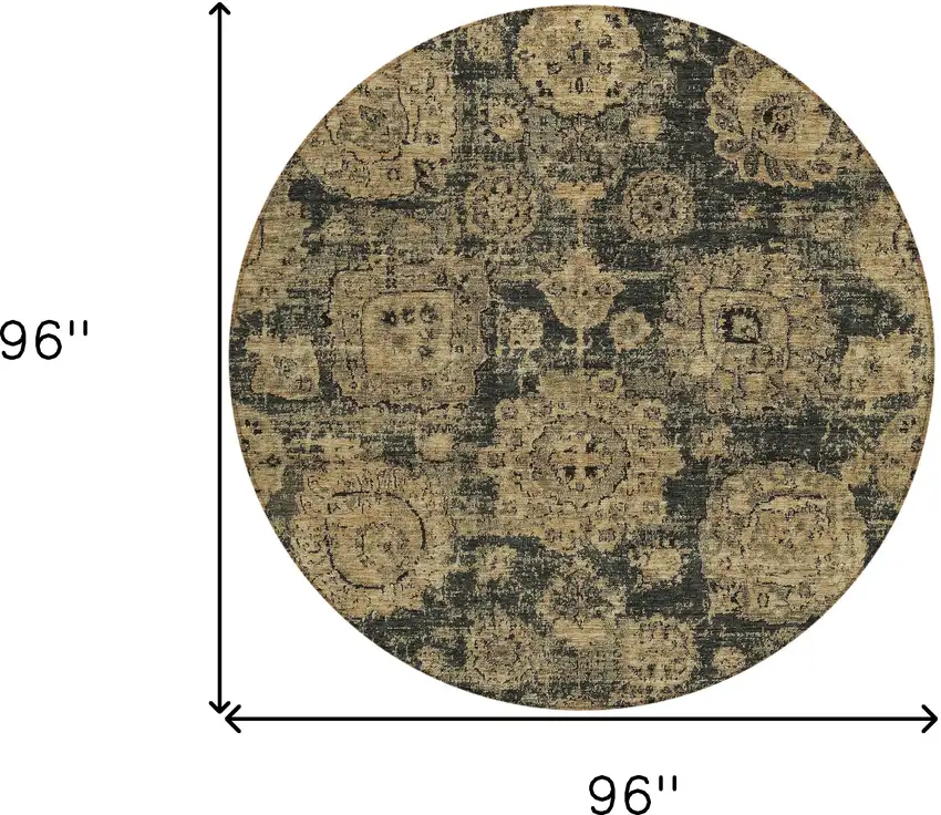8' Charcoal Gold And Tan Round Floral Washable Indoor Outdoor Area Rug