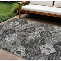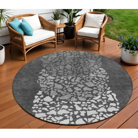 This 8-foot charcoal gray and silver round abstract washable indoor outdoor area rug, is a great way to add warmth to a room. This geometric round shaped rug features a abstract pattern in charcoal, gray, and silver that combines a good looking print with a unique and updated shape. The mix of shape, color, and design gives this rug refreshing visual interest. Ideal for outdoor spaces or high traffic areas with kids and pets, this rug is made from heavy duty polyester that is stain resistant to help repel water, dirt, and stains. Versatile in use, durable, and easy to maintain, this rug is an ideal solution to add a decorative and inviting touch to your indoor or outdoor space. 96-inch h x 96-inch w x 0.19-inch d.
