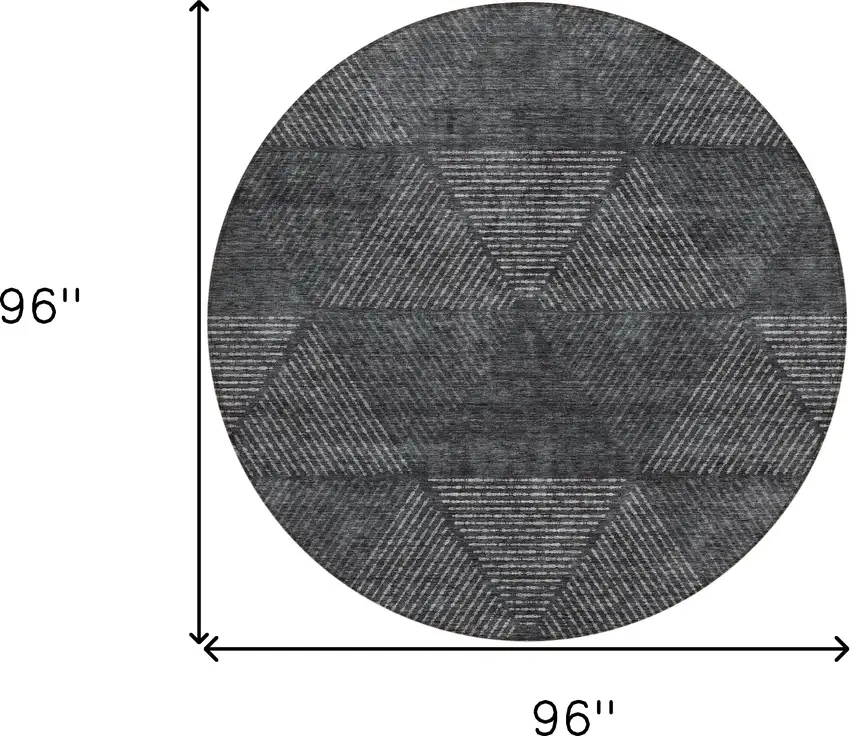 Set an inviting tone in your space with this 8-foot charcoal gray and silver round geometric washable indoor outdoor area rug. This geometric round shaped rug features a geometric pattern in charcoal, gray, and silver that combines a good looking print with a unique and updated shape. The mix of shape, color, and design gives this rug refreshing visual interest. Ideal for outdoor spaces or high traffic areas with kids and pets, this rug is made from heavy duty polyester that is stain resistant to help repel water, dirt, and stains. Makes a great way to dress up your patio, porch, or poolside, but also works well as a durable and easy to maintain option in the kitchen, family room, or mudroom. 96-inch h x 96-inch w x 0.19-inch d.