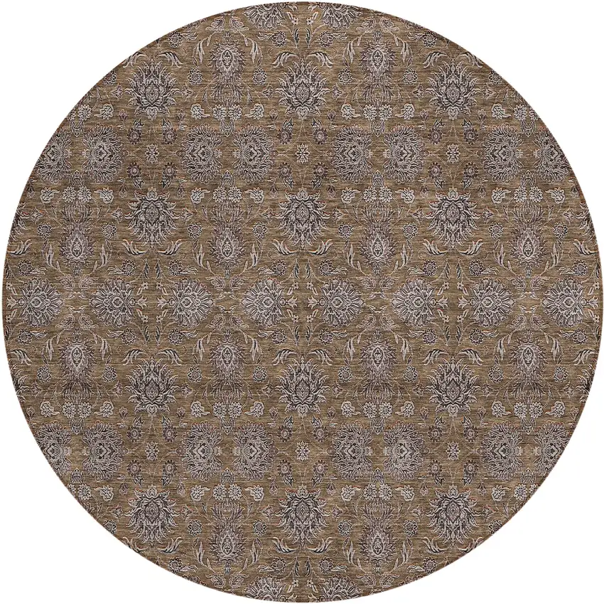 8' Chocolate And Gray Round Floral Washable Indoor Outdoor Area Rug