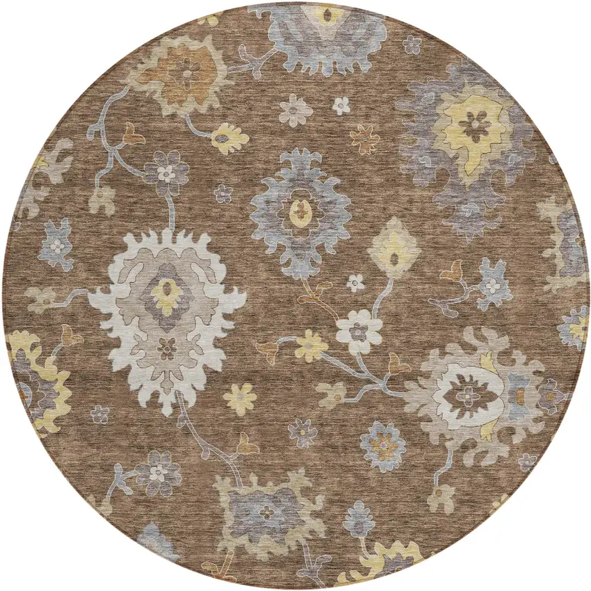 This 8-foot chocolate taupe and white round floral washable indoor outdoor area rug, is a great way to add warmth to a room. This geometric round shaped rug features a floral pattern in chocolate, taupe, and white that combines a good looking print with a unique and updated shape. The mix of shape, color, and design gives this rug refreshing visual interest. Ideal for outdoor spaces or high traffic areas with kids and pets, this rug is made from heavy duty polyester that is stain resistant to help repel water, dirt, and stains. Versatile in use, durable, and easy to maintain, this rug is an ideal solution to add a decorative and inviting touch to your indoor or outdoor space. 96-inch h x 96-inch w x 0.19-inch d.