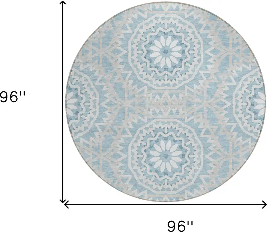 8' Denim Blue And Ivory Round Floral Medallion Washable Indoor Outdoor Area Rug