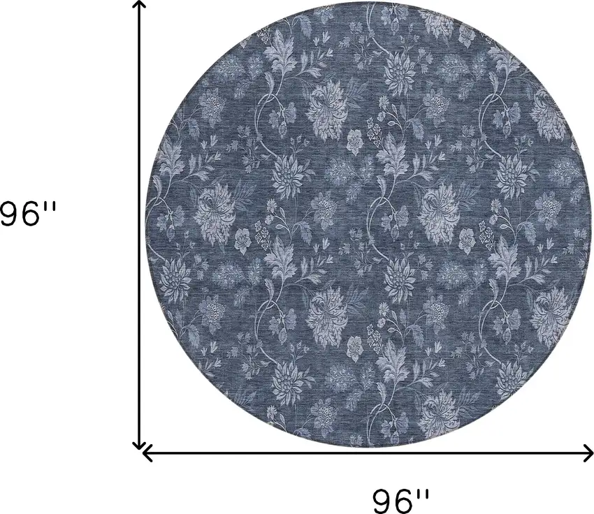 8' Denim Blue And Navy Blue Round Floral Washable Indoor Outdoor Area Rug