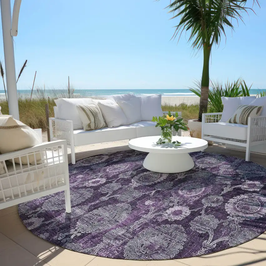 Add some artistry to your room with this 8-foot eggplant purple and lavender round damask washable indoor outdoor area rug. This geometric round shaped rug features a damask pattern in eggplant, purple, and lavender that combines a good looking print with a unique and updated shape. The mix of shape, color, and design gives this rug refreshing visual interest. Ideal for outdoor spaces or high traffic areas with kids and pets, this rug is made from heavy duty polyester that is stain resistant to help repel water, dirt, and stains. Versatile in use, durable, and easy to maintain, this rug is an ideal solution to add a decorative and inviting touch to your indoor or outdoor space. 96-inch h x 96-inch w x 0.19-inch d.