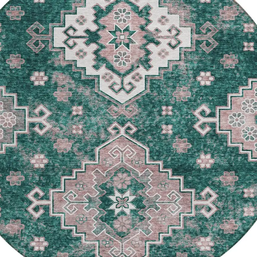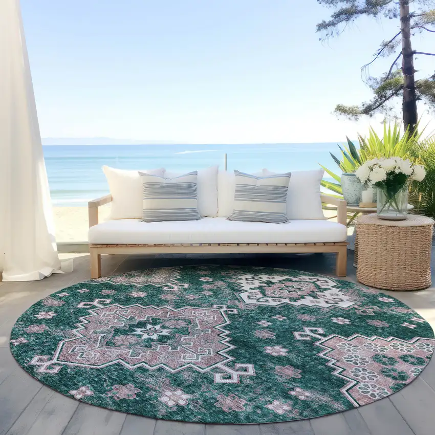 Add some artistry to your room with this 8-foot emerald brown and ivory round medallion washable indoor outdoor area rug. This geometric round shaped rug features a medallion pattern in emerald, brown, and ivory that combines a good looking print with a unique and updated shape. The mix of shape, color, and design gives this rug refreshing visual interest. Ideal for outdoor spaces or high traffic areas with kids and pets, this rug is made from heavy duty polyester that is stain resistant to help repel water, dirt, and stains. Versatile in use, durable, and easy to maintain, this rug is an ideal solution to add a decorative and inviting touch to your indoor or outdoor space. 96-inch h x 96-inch w x 0.19-inch d.