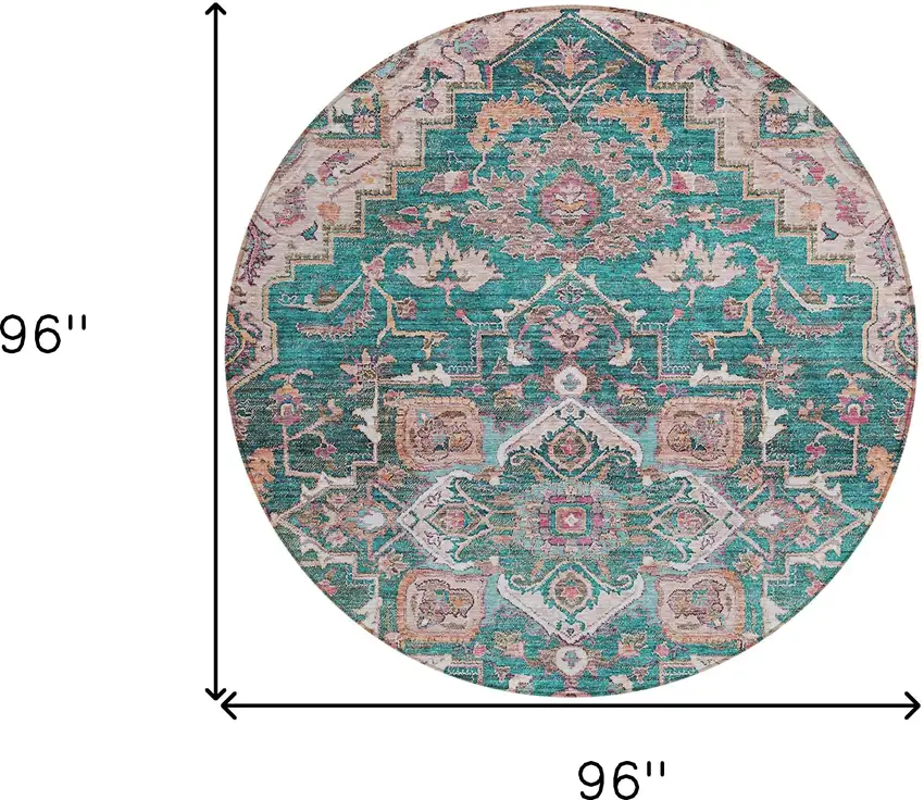Set an inviting tone in your space with this 8-foot emerald teal blue and beige round oriental washable indoor outdoor area rug. This geometric round shaped rug features a oriental pattern in emerald, teal blue, and beige that combines a good looking print with a unique and updated shape. The mix of shape, color, and design gives this rug refreshing visual interest. Ideal for outdoor spaces or high traffic areas with kids and pets, this rug is made from heavy duty polyester that is stain resistant to help repel water, dirt, and stains. Makes a great way to dress up your patio, porch, or poolside, but also works well as a durable and easy to maintain option in the kitchen, family room, or mudroom. 96-inch h x 96-inch w x 0.19-inch d.