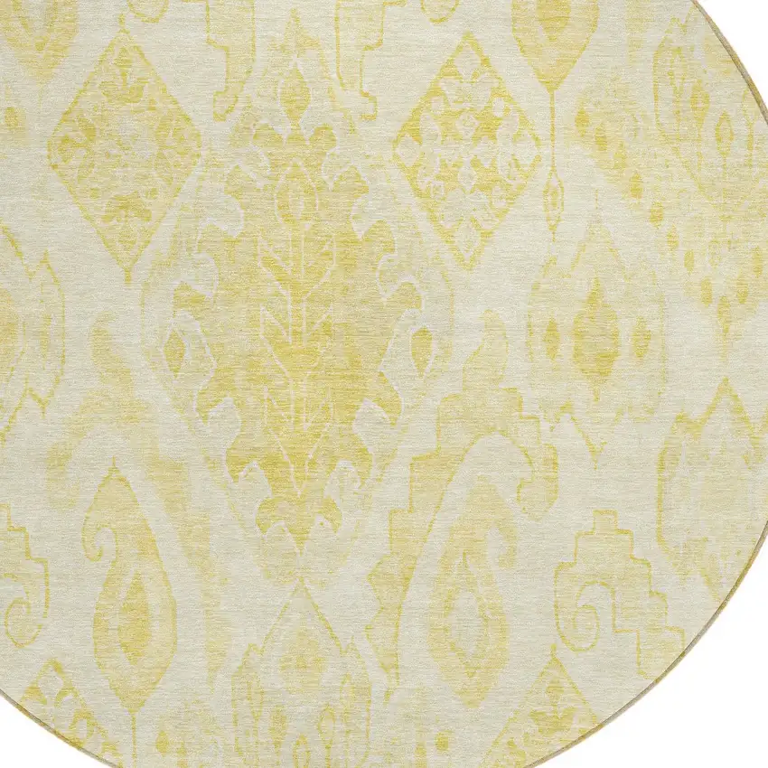 Add some artistry to your room with this 8-foot gold ivory and beige round moroccan washable indoor outdoor area rug. This geometric round shaped rug features a moroccan pattern in gold, ivory, and beige that combines a good looking print with a unique and updated shape. The mix of shape, color, and design gives this rug refreshing visual interest. Ideal for outdoor spaces or high traffic areas with kids and pets, this rug is made from heavy duty polyester that is stain resistant to help repel water, dirt, and stains. Versatile in use, durable, and easy to maintain, this rug is an ideal solution to add a decorative and inviting touch to your indoor or outdoor space. 96-inch h x 96-inch w x 0.19-inch d.