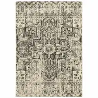 8' Gray And Ivory Oriental Washable Round Rug With UV Protection
