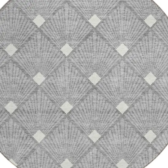 Set an inviting tone in your space with this 8-foot gray and ivory round geometric washable indoor outdoor area rug. This geometric round shaped rug features a geometric pattern in gray and ivory that combines a good looking print with a unique and updated shape. The mix of shape, color, and design gives this rug refreshing visual interest. Ideal for outdoor spaces or high traffic areas with kids and pets, this rug is made from heavy duty polyester that is stain resistant to help repel water, dirt, and stains. Makes a great way to dress up your patio, porch, or poolside, but also works well as a durable and easy to maintain option in the kitchen, family room, or mudroom. 96-inch h x 96-inch w x 0.19-inch d.