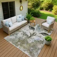 8' Gray And Ivory Round Geometric Washable Indoor Outdoor Area Rug