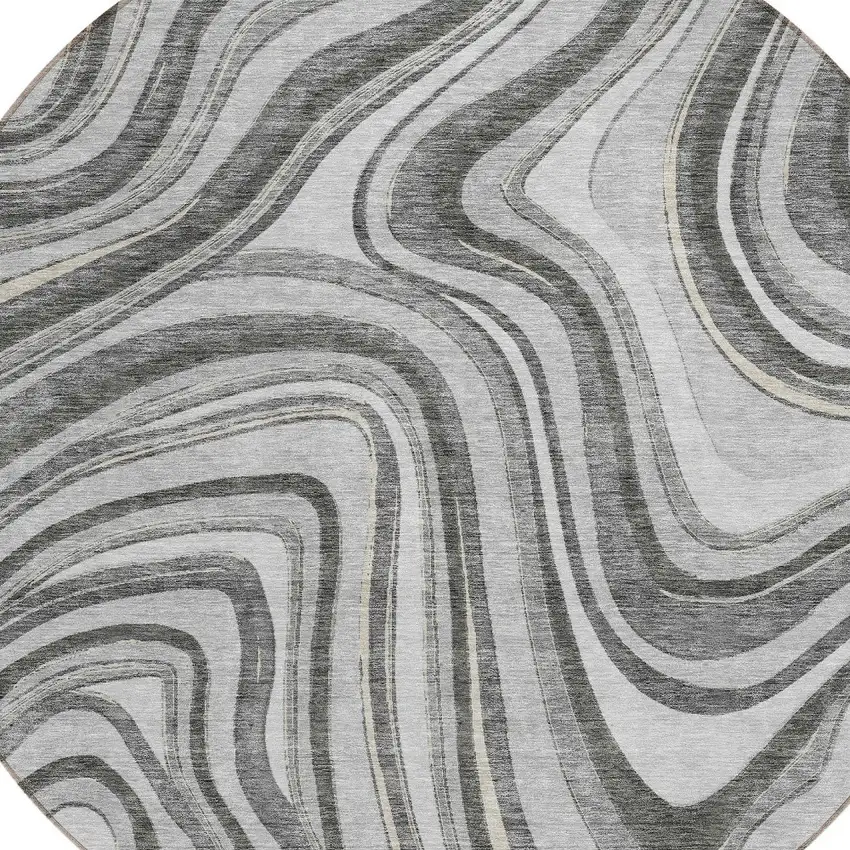 Add some artistry to your room with this 8-foot gray charcoal and ivory round abstract washable indoor outdoor area rug. This geometric round shaped rug features a abstract pattern in gray, charcoal, and ivory that combines a good looking print with a unique and updated shape. The mix of shape, color, and design gives this rug refreshing visual interest. Ideal for outdoor spaces or high traffic areas with kids and pets, this rug is made from heavy duty polyester that is stain resistant to help repel water, dirt, and stains. Versatile in use, durable, and easy to maintain, this rug is an ideal solution to add a decorative and inviting touch to your indoor or outdoor space. 96-inch h x 96-inch w x 0.19-inch d.