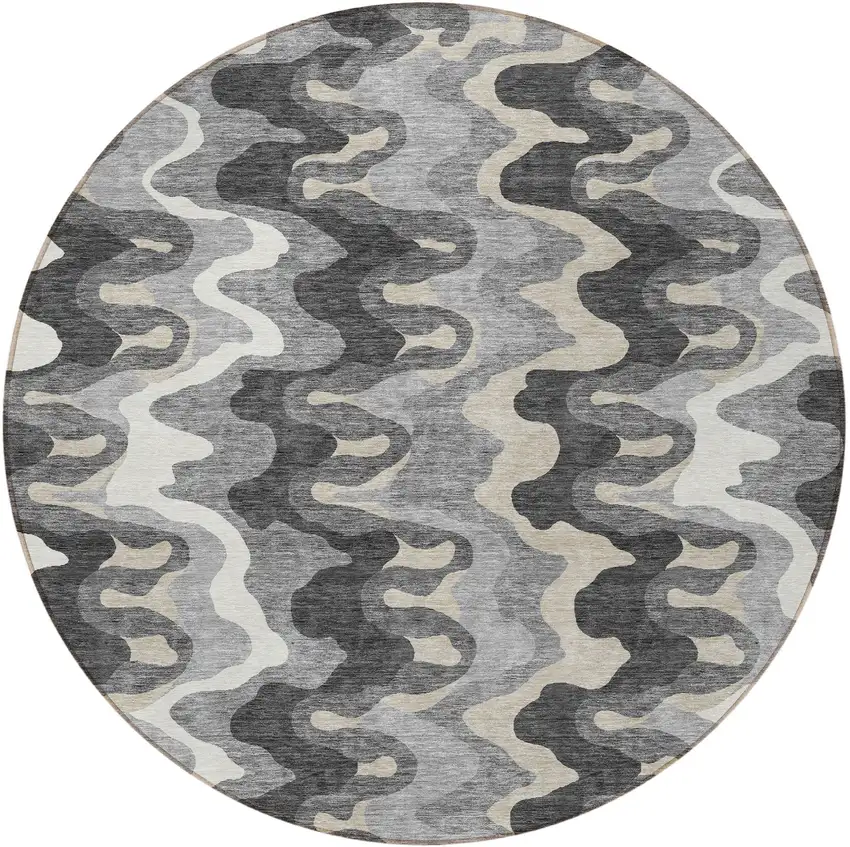 Add great coloration and comfortable texture to your space with this 8-foot gray silver and charcoal round abstract washable indoor outdoor area rug. This geometric round shaped rug features a abstract pattern in gray, silver, and charcoal that combines a good looking print with a unique and updated shape. The mix of shape, color, and design gives this rug refreshing visual interest. Ideal for outdoor spaces or high traffic areas with kids and pets, this rug is made from heavy duty polyester that is stain resistant to help repel water, dirt, and stains. Makes a great way to dress up your patio, porch, or poolside, but also works well as a durable and easy to maintain option in the kitchen, family room, or mudroom. 96-inch h x 96-inch w x 0.19-inch d.