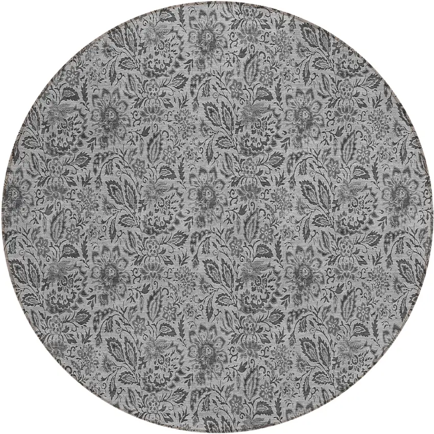 This 8-foot gray silver and charcoal round floral washable indoor outdoor area rug, is a great way to add warmth to a room. This geometric round shaped rug features a floral pattern in gray, silver, and charcoal that combines a good looking print with a unique and updated shape. The mix of shape, color, and design gives this rug refreshing visual interest. Ideal for outdoor spaces or high traffic areas with kids and pets, this rug is made from heavy duty polyester that is stain resistant to help repel water, dirt, and stains. Versatile in use, durable, and easy to maintain, this rug is an ideal solution to add a decorative and inviting touch to your indoor or outdoor space. 96-inch h x 96-inch w x 0.19-inch d.
